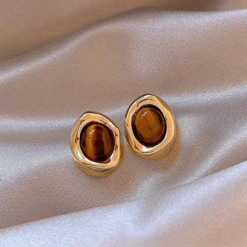 Gold Oval Coffee Bean Earrings with Brown Stone